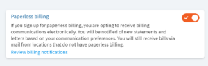 If the toggle is gray with no check box, then paperless billing is disabled. If the toggle is orange with a check box, then paperless billing is enabled.