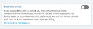 If the toggle is gray with no check box, then paperless billing is disabled. If the toggle is orange with a check box, then paperless billing is enabled.