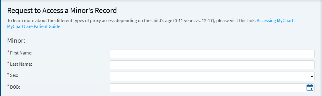 In the MyChart Proxy Enrollment section, select the link for "Request Full Proxy Access to a Child's MyChart Information."