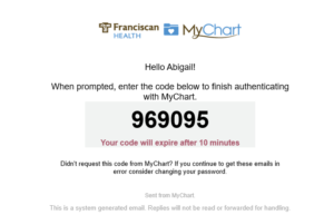 Please allow 2 minutes for the code to be delivered. It will come from “noreply@franciscanalliance.org”. If you are concerned that the email is blocked, please review Common Email Instructions for suggested steps.